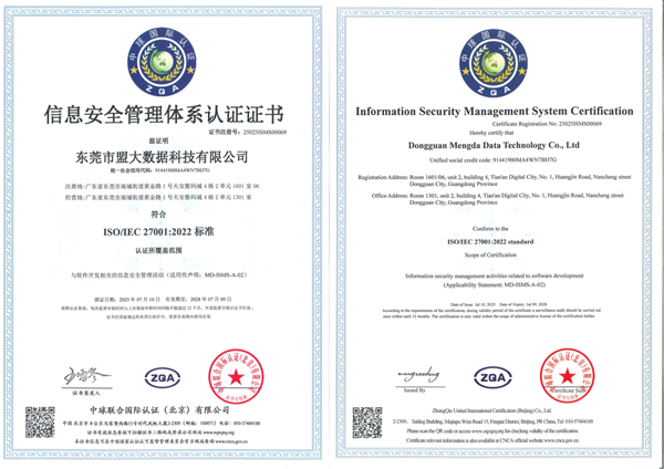 近日,盟大集团全资子公司东莞市盟大数据科技有限公司成功通过信息安全管理体系(ISO/IEC 27001)再认证。此次认证范围覆盖与软件开发相关的信息安全管理活动,标志着公司旗下盟大企业购平台在保障客户数据安全、系统稳定运行及业务连续性方面构建了符合国际标准的坚实防御体系,数字化服务能力再添权威背书。