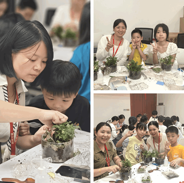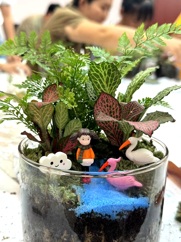 正值暑假期间,萌二代们的活跃身影和叽叽喳喳的欢快交流声,让活动现场热闹非凡。培训机构专业老师的讲解一结束,大家便迫不及待地“上手”。巧手轻抚翠绿的叶片,细致铺陈彩砂与苔藓,再点缀以玲珑的玩偶装饰——方寸盆钵之内,天马行空的创意蓬勃生长。大家时而凝神屏息专注手中细节,时而转头与邻座交流心得:“原来组合不同植物就像协调生活节奏,高低错落才显出生机!”苔藓的湿润触感与叶片的清新气息交织,让忙碌的双手与心灵一同沉浸于创造的宁静愉悦中。