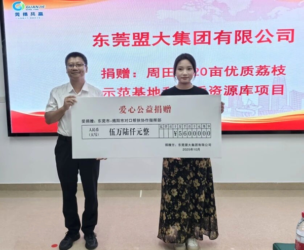 盟大集团作为东莞企业代表之一积极响应,在10月10日举行的东莞揭阳对口帮扶捐赠仪式上,定向捐赠 5.6 万元,专项用于惠来县周田镇 20 亩优质荔枝示范基地及种质资源库建设,续写与揭阳的帮扶情谊,助力“百千万工程”和乡村振兴。