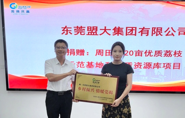 此次揭阳之行,盟大集团将公益视角聚焦于当地特色农业发展。在东莞揭阳产业有序转移座谈交流会暨 “万企兴万村” 行动捐赠仪式上,盟大集团定向捐建的周田镇 20 亩优质荔枝示范基地和种质资源库项目,是莞揭对口帮扶中 “荔枝产业提质” 的核心项目。