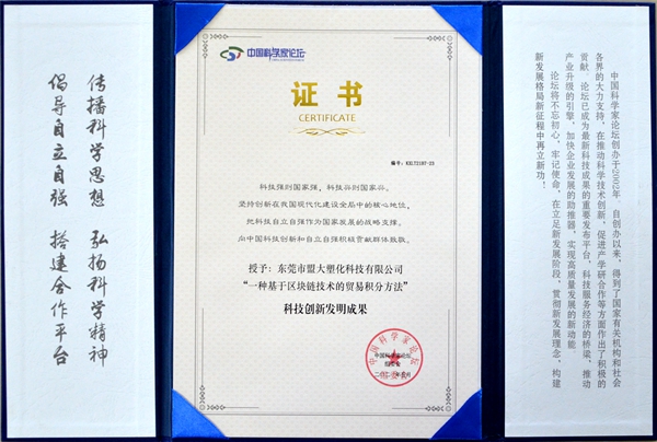 近日,第十八届中国科学家论坛在京召开,来自全国各地各行业的院士专家、科技工作者、企业家代表出席,会议主题围绕“十四五”科技赋能与企业创新转型、国家创新与科技发展战略、数字化产业化与区块链技术等议题进行了交流探讨。会上,盟大独家研发的“一种基于区块链技术的贸易积分方法”获得“科技创新发明成果”奖,盟大同时荣获“科技创新先进单位”。